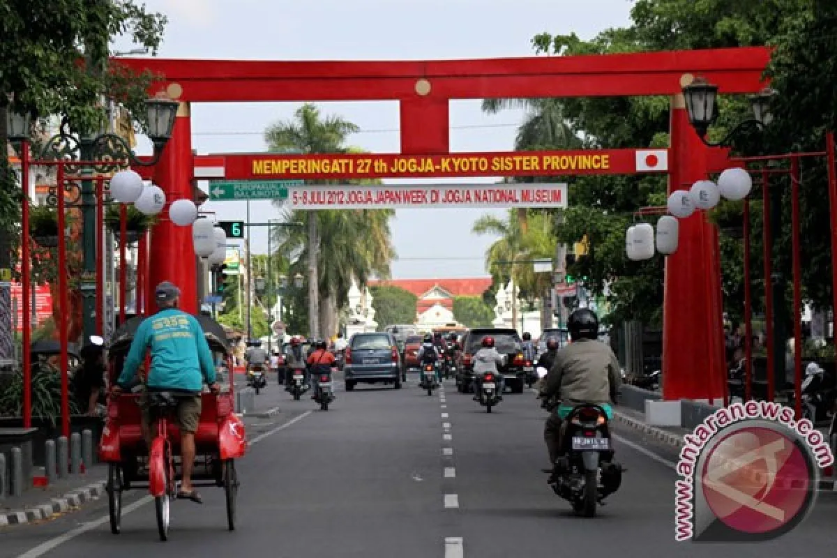 YOGYAKARTA - Sejumlah pengguna jalan melintas di bawah gerbang merah bertuliskan "Memperingati 27 th Jogja-Kyoto Sister Province" di Jl. Ahmad Yani, Yogyakarta, Senin (18/6). Pembuatan gerbang tersebut bertujuan untuk memperingati hubungan Jogja-Kyoto Sister City yang sudah berlangsung sejak 1985 dan juga sebagai ajang pembelajaran kebudayaan tradisional Jepang dan Indonesia. FOTO ANTARA/Noveradika/12