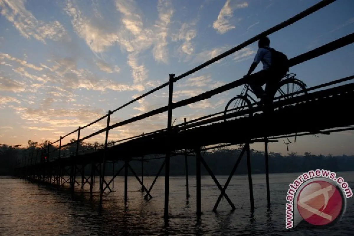 YOGYAKARTA - Seorang pengendara sepeda melintasi jembatan bambu yang menghubungkan antara kabupaten Kulonprogo dan Bantul di kawasan Sentolo, Kulonprogo, Yogyakarta, Sabtu (28/7). Sejumlah warga mengaku memanfaatkan jembatan bambu yang dibangun hanya saat air sungai Progo surut tersebut guna mempersingkat jarak tempuh. FOTO ANTARA/Andreas Fitri Atmoko/nov/12