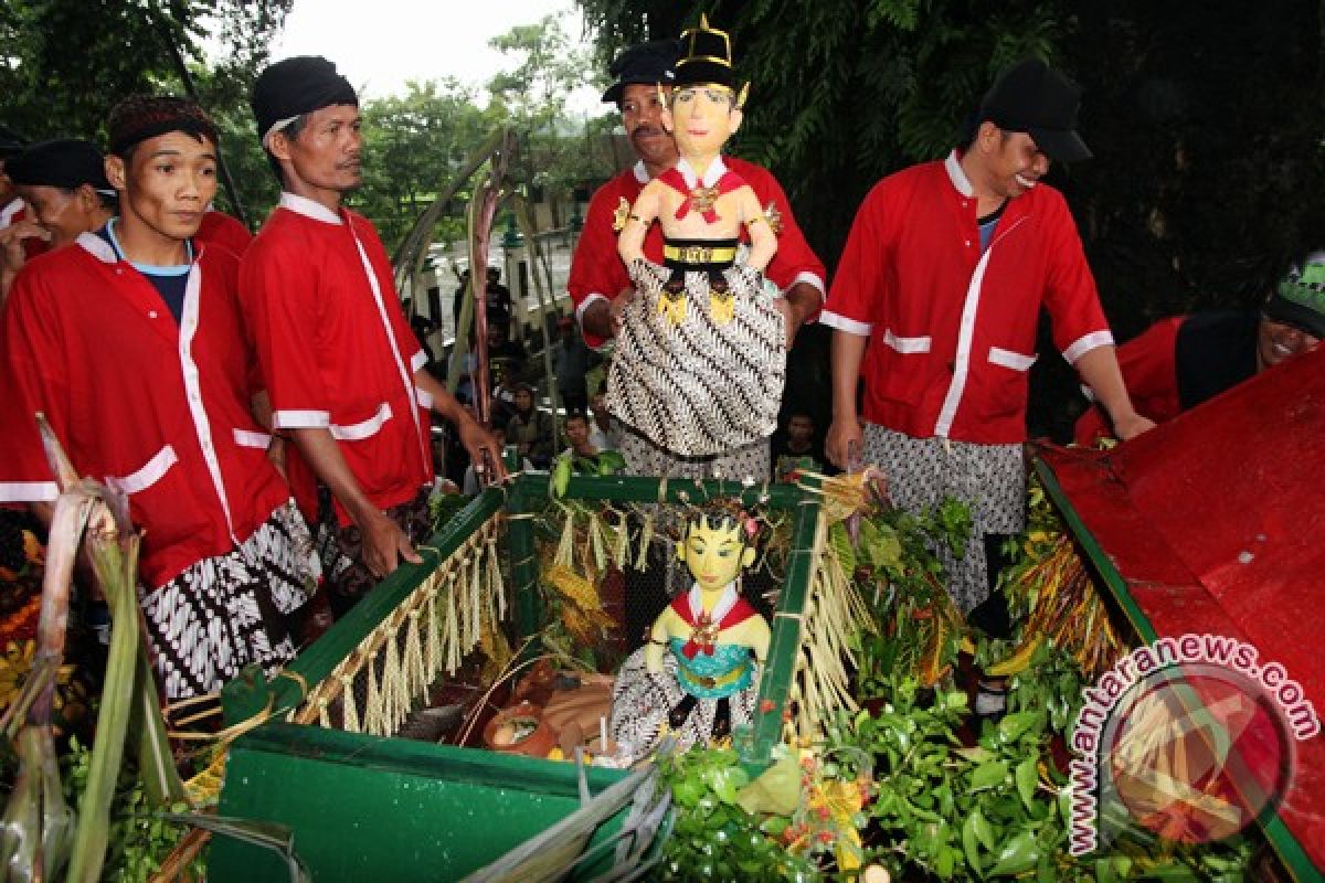 Seorang tokoh masyarakat setempat mengangkat Bekakak yang terbuat dari campuran tepung beras ketan di area pasanggrahan Gunung Gamping, Desa Ambarketawang, Gamping, Sleman, Yogyakarta, Jumat (28/12). Upacara adat Saparan Bekakak merupakan sebuah ritual guna memperingati kesetiaan abdi dhalem Kraton Yogyakarta, Ki Wirosuto serta meminta keselamatan bagi penduduk agar terhindar dari malapetaka. (Foto ANTARA/ Wisnu Wijaya/Ags/12)