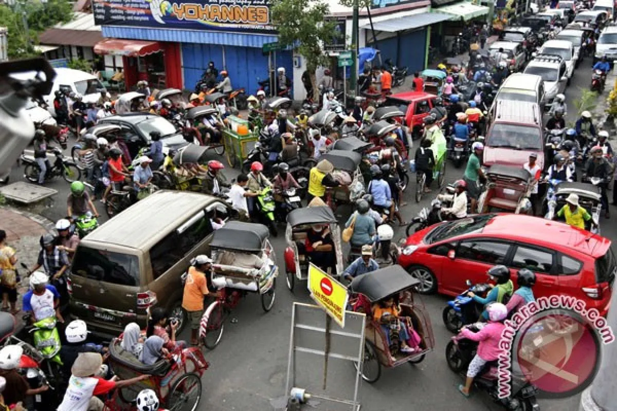 YOGYAKARTA - Sejumlah kendaraan terjebak macet di Perempatan Kauman, Yogyakarta, Senin (31/12). Tingginya volume kendaraan akibat liburan akhir tahun membuat sejumlah ruas jalan menuju sejumlah tempat wisata di Kota Yogyakarta macet, dan kemacetan tersebut diprediksi akan mencapai puncaknya pada perayaan pergantian tahun nanti. FOTO ANTARA/Noveradika/12