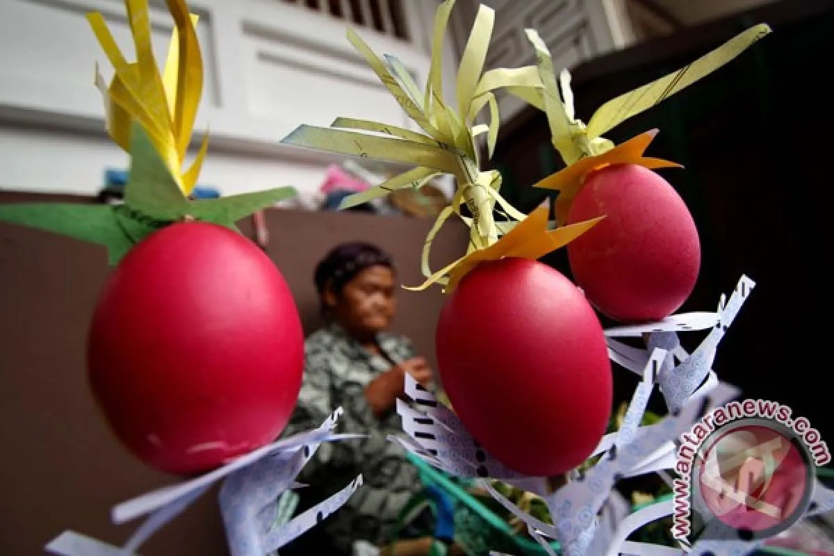 YOGYAKARTA - Seorang pedagang menunggu telur merah (ndog abang) dagangannya di halaman Masjid Gede, Kauman, Yogyakarta, Minggu (20/1). Ndog abang yang selalu dijual pada perayaan Sekaten tersebut memiliki makna filosofis yakni sebagai simbol kelahiran kembali untuk masa depan yang lebih baik, lebih sejahtera dengan tetap berpedoman kepada garis yang ditentukan oleh sang pencipta. FOTO ANTARA/Noveradika/13