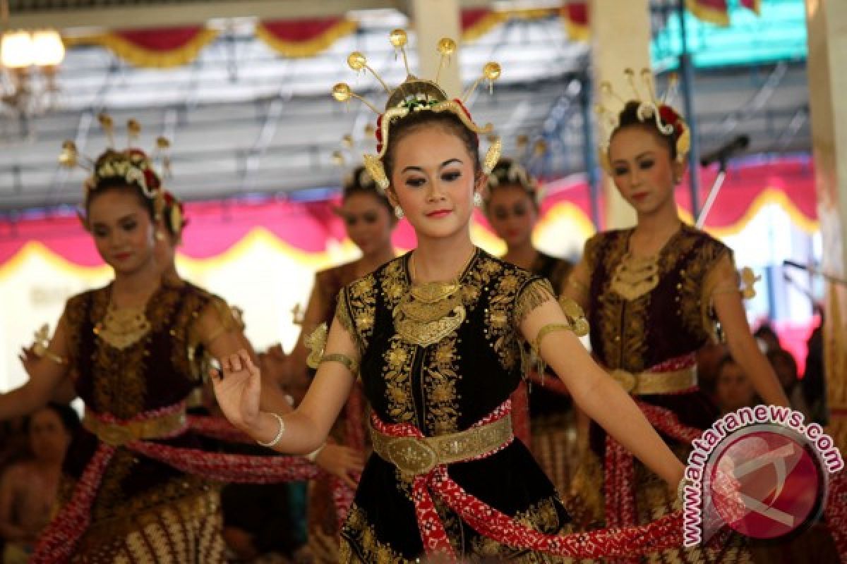 Penari membawakan Tari Sekar Pudyastuti pada acara Syawalan Abdi Dalem di Bangsal Kepatihan, Yogyakarta, Rabu (27/8). Tari Sekar Pudyastuti merupakan tarian klasik gaya Yogyakarta untuk upacara penyambutan dengan menampilkan gerakan tarian gaya perempuan Yogyakarta yang anggun. ANTARA FOTO/Noveradika/14