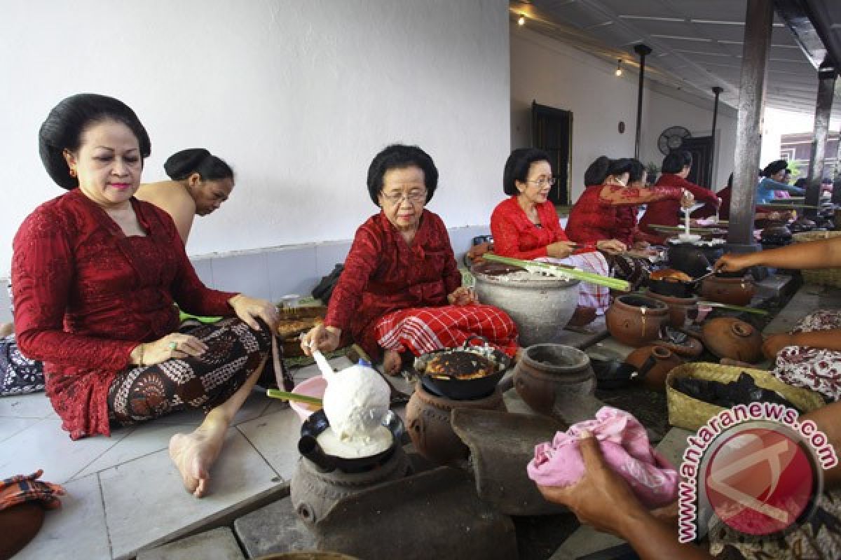 Keluarga dan abdi dalem Keraton Ngayogyakarta melaksanakan prosesi Apeman yaitu pembuatan kue apem di Bangsal Kedaton Sekar Kedaton, Keraton Ngayogyakarta, Yogyakarta, Minggu (17/5). Prosesi apeman merupakan salah satu bagian prosesi Tinggalan Dalem Jumenengan atau hari ulang tahun naik tahta yang Ke-26 Sultan HB X dan Kue apem dalam prosesi tersebut menjadi simbol ungkapan syukur sekaligus permohonan ampunan atas segala kesalahan. (Foto ANTARA/Andreas Fitri Atmoko/ags/15)