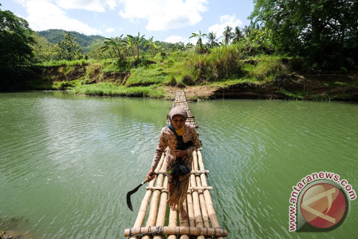 Seorang warga melintas di jembatan sesek desa Selopamioro, Imogiri, Bantul, Selasa (24/10). Jembatan darurat yang terbuat dari bambu dengan panjang sekitar 30 meter ini membentang di atas sungai Oyo dan merupakan jalur alternatif penghubung antara desa Sriharjo dengan desa Selopamioro, Imogiri. Jembatan ini hanya bisa di digunakan saat musim kemarau saja, apabila musim penghujan tiba masyarakat akan membongkar jembatan bambu tersebut agar tidak hanyut karena meningkatnya debit air dan arus sungai oyo yang semakin deras. (Foto ANTARA/Dimas Andika/ags/17)