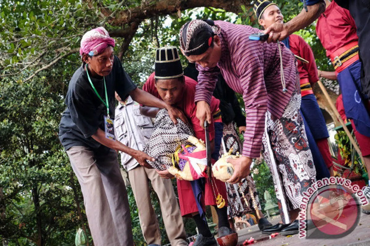 Camat Gamping Abu Bakar, S.Sos, M.Si didampingi Lurah Ambarketawang Sumaryanto melakukan proses pemotongan bekakak di Gunung Gamping, Ambarketawang, Gamping, Sleman, Jumat (3/11). Tradisi saparan bekakak merupakan sebuah tradisi yang digelar setiap pertengahan bulan Sapar yang bertujuan untuk mengenang jasa Ki Wirosuto yang merupakan abdi dalem kesayangan Sultan Hamengkubuwono I. Sepasang manusia yang terbuat dari nasi ketan sebagai perwujudan sosok Ki Wirosuto dan istrinya akan dipotong dan dibagikan kepada warga masyarakat yang menyaksikan prosesi bekakak.(Foto ANTARA/Dimas Andika/ags/17)