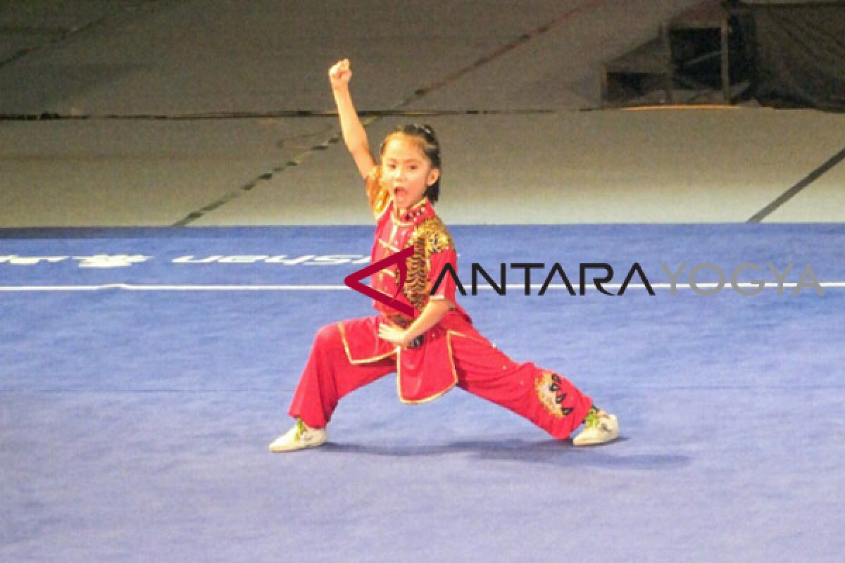 Atlet junior wushu ketika menunjukkan aksinya dalam Opening Ceremony Kejurnas Wushu Junior & Senior di Gor Among Rogo, Yogyakarta, Kamis (29/3). Kejurnas Wushu Junior & Senior akan memperebutkan Piala Raja Hamengku Buwono X dan Piala Bergilir Preside