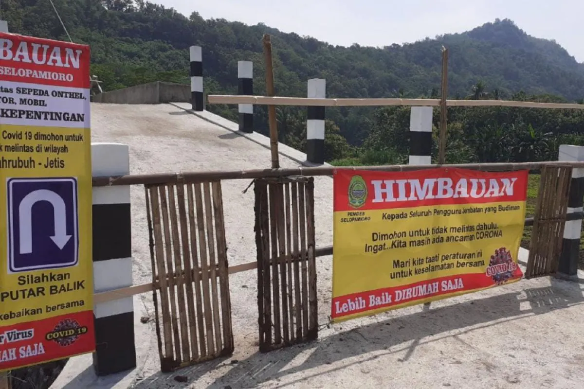 Bantul (ANTARA) - Jembatan gantung yang terletak di Dusun Pengkol, Desa Sriharjo, Kecamatan Imogiri, Kabupaten Bantul, Daerah Istimewa Yogyakarta, ditutup total guna mencegah kerumunan pengunjung wisata dan pengendara sepeda yang berpotensi terjadi penularan corona virus disease 2019 (COVID-19).