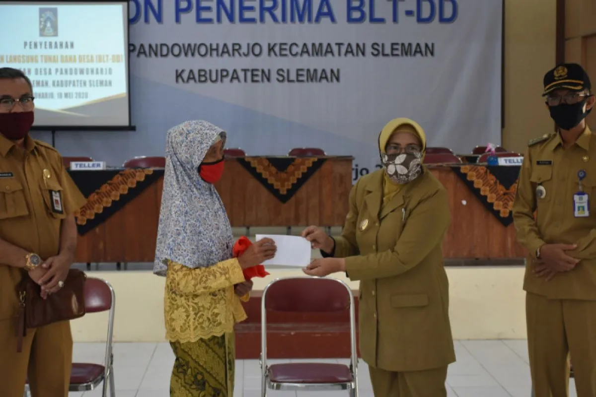 Sleman (ANTARA) - Wakil Bupati Sleman, Daerah Istimewa Yogyakarta Sri Muslimatun didampingi Kepala Dinas Pemberdayaan Masyarakat Desa (PMD) Budiharjo menyerahkan bantuan langsung tunai (BLT) dana desa kepada 140 kepala keluarga di Desa Pandowoharjo di Balai Desa Pandowoharjo, Senin.