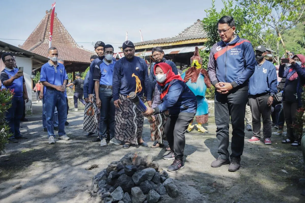 Bupati Sleman Kustini Sri Purnomo memimpin langsung kegiatan pengambilan api pertama dari Gunung Merapi dalam rangkaian dimulainya perhelatan Porda XVI dan Peparda III DIY di Museum Petilasan Mbah Maridjan, Cangkringan, Sabtu (20/8/22). ANTARA/HO-Bagian Prokopim Setda Sleman