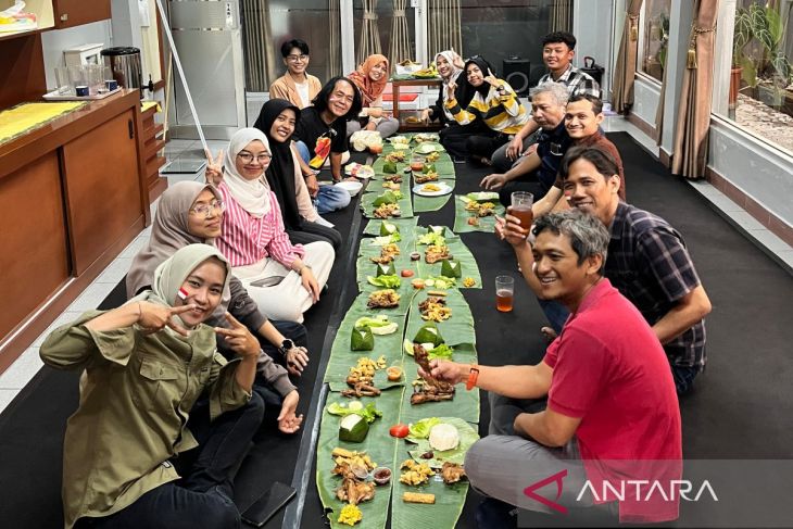Sebagai acara penutup, digelar makan bersama secara lesehan. Seluruh makanan disajikan di atas daun pisang yang digelar di lantai, menciptakan suasana yang akrab dan sederhana. Tak ketinggalan, buah-buahan, termasuk pisang yang merupakan hasil kebun milik Victorianus Sat Pranyoto, pegawai ANTARA Biro DIY, turut disajikan dalam acara tersebut, menambah kehangatan dan kebersamaan di antara para peserta.