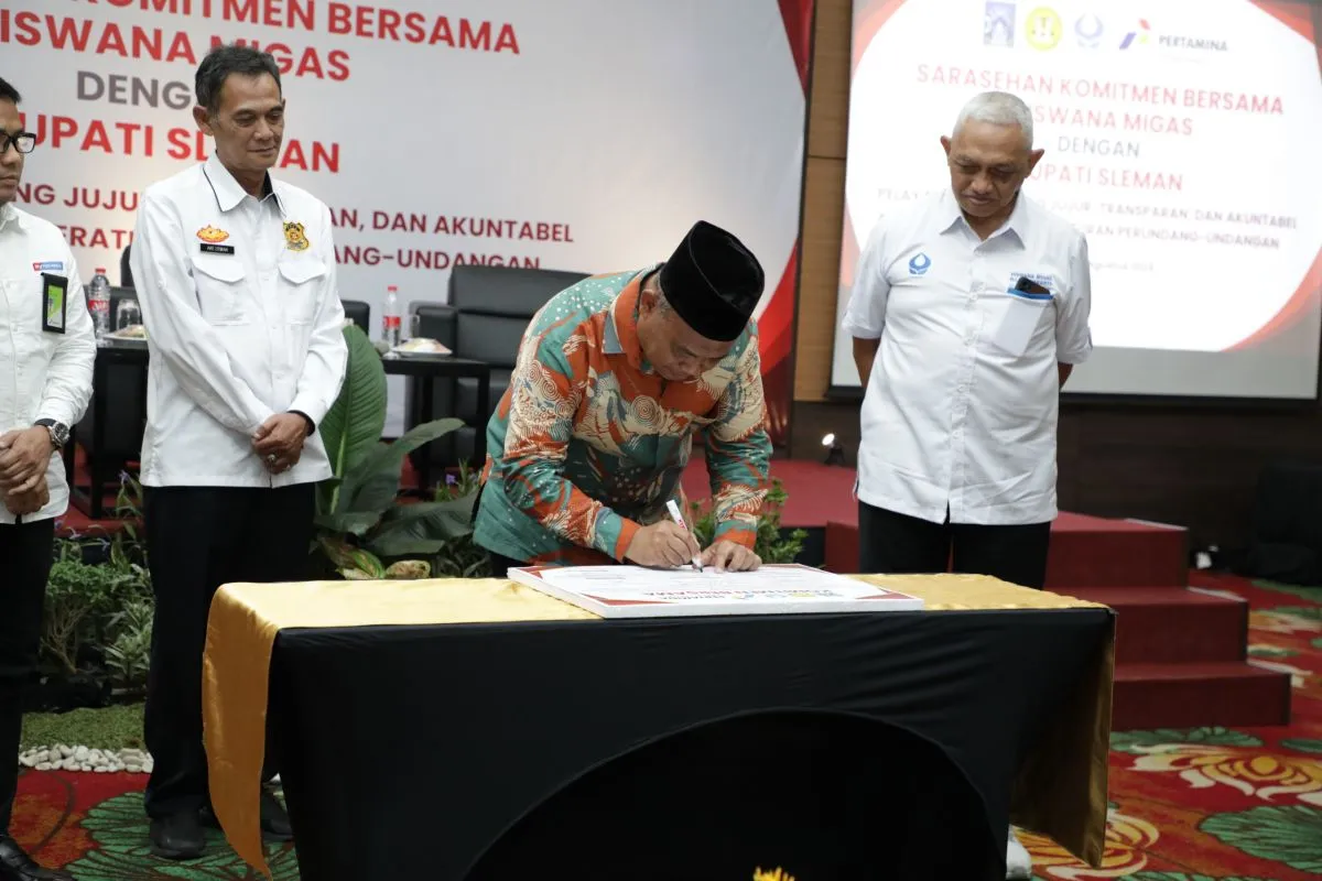 Komitmen tersebut ditandatangani Bupati Sleman Harda Kiswaya, Ketua Hiswana Migas DIY SPBU Aryanto Sukoco, Ketua Bidang SPBU Hiswana Migas DIY Bangun Wahyu Aji Wira Perwakilan Pemilik SPBU Wira Adyaksa, SAM Retail Yogyakarta PT Pertamina Patra Niaga Weddy Surya Windrawan dan Ketua Pengawasan Metrologi Legal dan Pemberdayaan Masyarakat Direktorat Metrologi Ake Erwan di Sleman, Kamis.
