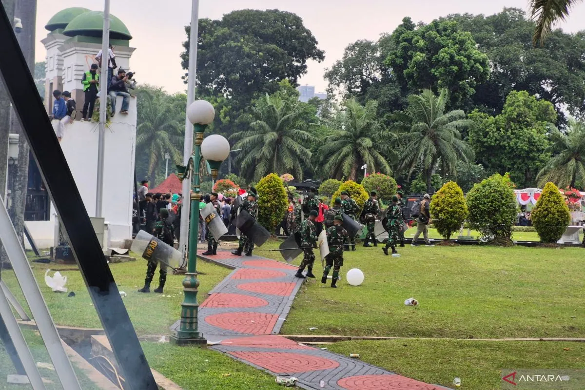 Jakarta (ANTARA) - Sejumlah personel TNI Angkatan Darat mencoba untuk meredam amarah para demonstran di depan pintu utama Gedung DPR/MPR RI, Jakarta Pusat, sejak Jumat siang.