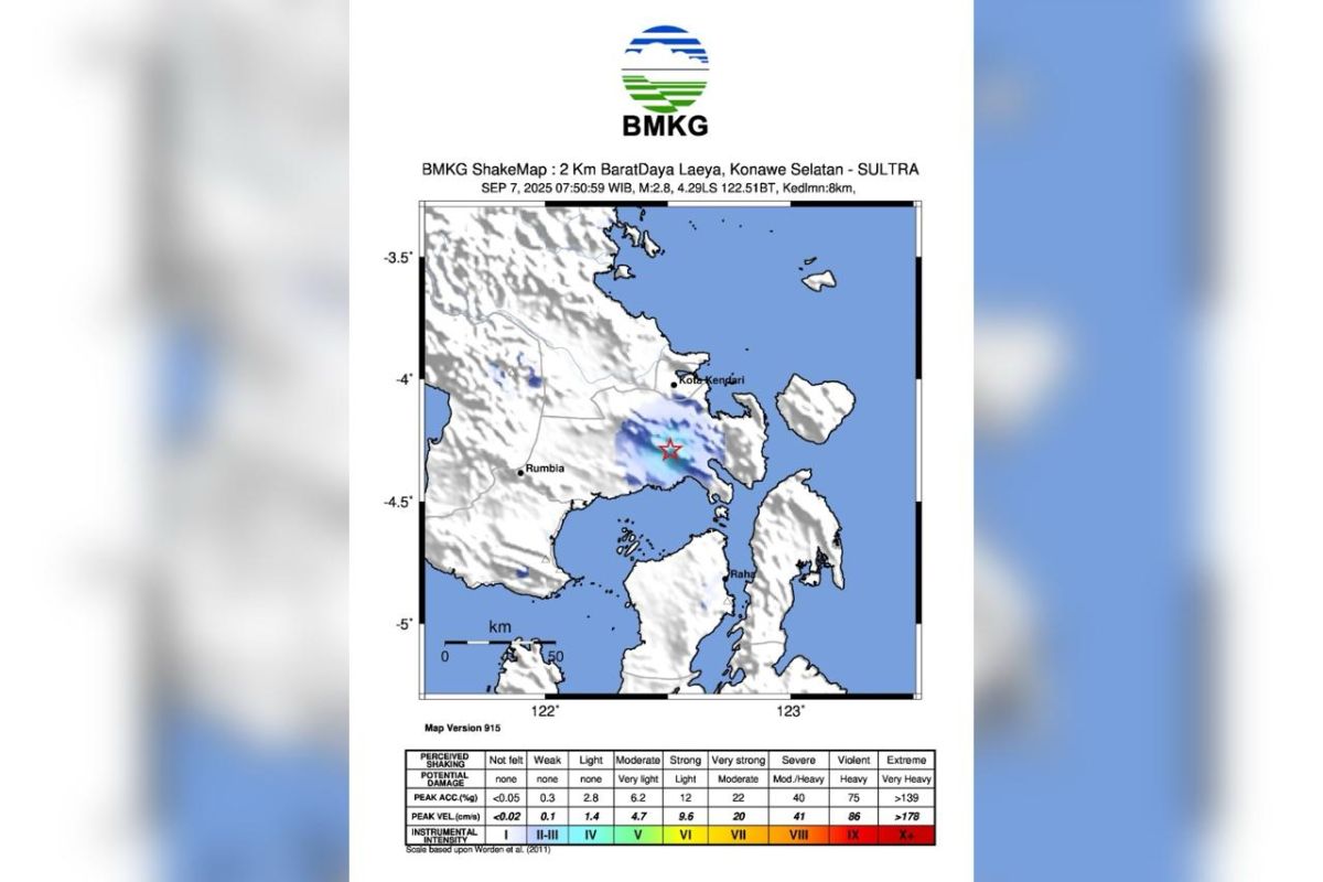 Kepala Stasiun Geofisika BMKG Kendari Rudin saat dihubungi di Kendari, Minggu, mengatakan bahwa gempa bumi tersebut terjadi sekitar pukul 08.51 Wita di wilayah Barat Daya, Kecamatan Laeya, Kabupaten Konsel.