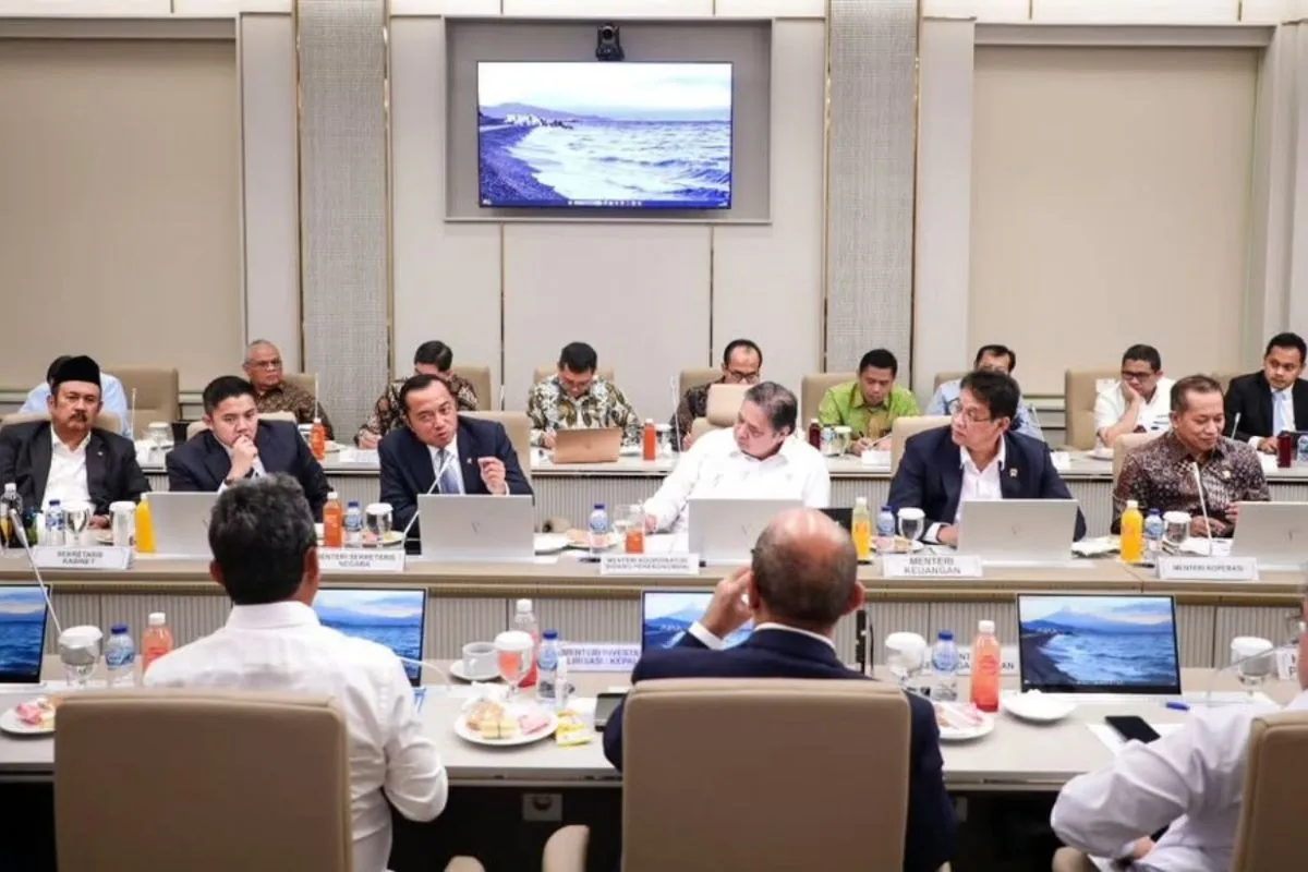 Sekretaris Kabinet Teddy Indra Wijaya (dua kiri) bersama Menteri Sekretaris Negara Prasetyo Hadi (tiga kiri) menghadiri undangan Menteri Koordinator Bidang Perekonomian Airlangga Hartarto (empat kiri) dalam rapat terbatas di Wisma Danantara, Jakarta, Rabu (1/10/2025). ANTARA/Instagram/@sekretariat.kabinet