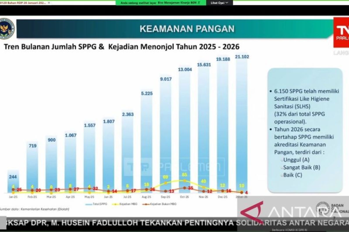 Hingga saat ini, katanya, 6.150 Satuan Pelayanan Pemenuhan Gizi (SPPG) telah mengantongi Sertifikasi Laik Higiene Sanitasi (SLHS) atau 32 persen dari total SPPG yang beroperasi.