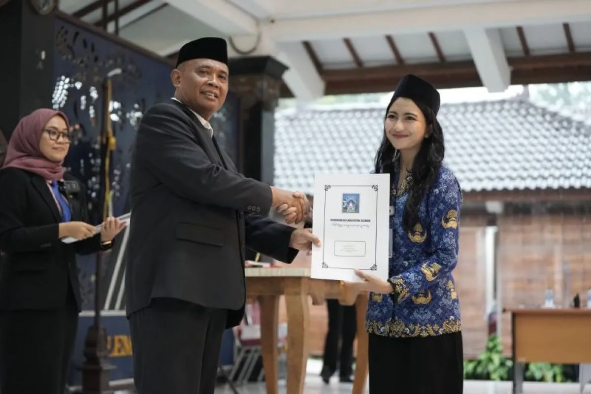Turut mendampingi Bupati Sleman Harda Kiswaya pada penyerahan SK tersebut Sekretaris Daerah Kabupaten Sleman Susmiarto.