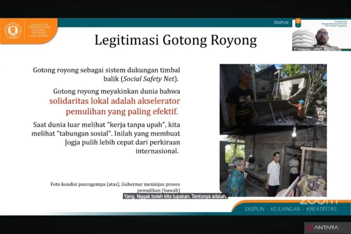 "Jadi modalitas sosial ini membuat masyarakat Yogyakarta mampu melakukan transformasi dari kondisi rapuh pascabencana menjadi subjek aktif dalam pembangunan kembali wilayahnya," ungkapnya.